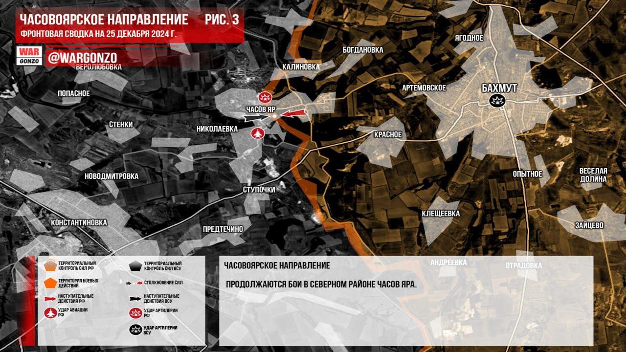 Ситуация на 25.12.2024 08:17. Канал Wargonzo сообщает: на утро 25.12.2024 российские войска на Запорожском фронте восстановили большинство утраченных позиций в районе Каменского, при этом отмечается активное перемещение техники противника в тыловых районах. На Донецком фронте в Курахово российские войска добились тактических успехов, однако контроль над всей жилой застройкой остается под вопросом из-за сохранения присутствия ВСУ. В Часовоярском направлении продолжаются бои, в то время как на Курском направлении ВСУ, несмотря на давление со стороны российских войск, проводят контратаки, которые замедляют продвижение российских сил, но не приносят тактических успехов.