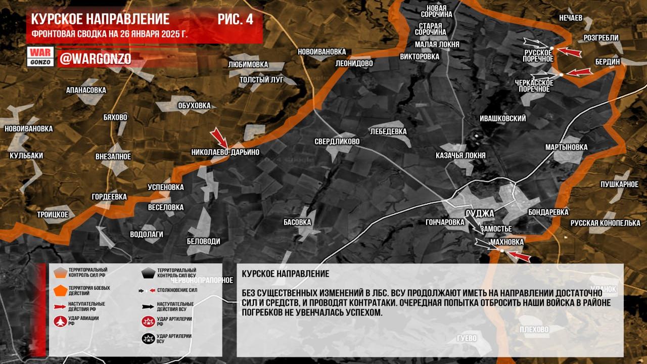 Ситуация на 26.01.2025 10:19. Канал Wargonzo сообщает: Фронтовая сводка на утро 26.01.2025 отмечает, что на запорожском фронте продолжатся позиционные бои, при этом активно используются средства дальнего поражения с обеих сторон, ситуация остается без существенных изменений. На донецком фронте российские войска продвигаются в Великой Новоселке, где украинские силы, судя по всему, уже покинули населённый пункт, что может привести к его освобождению. Также продолжается движение российских войск на запад от Курахово и есть продвижения в районе Дачного. На часовоярском направлении российские войска продолжают владеть инициативой, однако украинцы оказывают серьезное сопротивление. В Курской области ситуация также без существенных изменений, ВСУ сохраняют силы и проводят контратаки, очередная попытка российских войск в районе Погребков была неудачной.