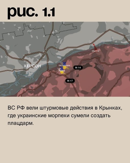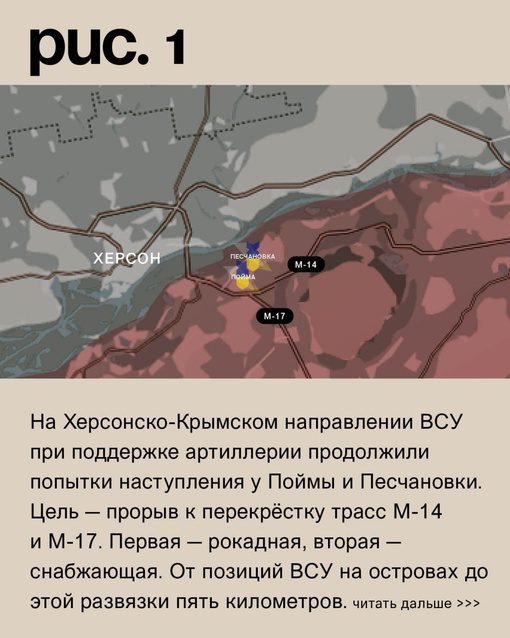 На Херсонско-Крымском направлении ВСУ с поддержкой артиллерии пытаются наступить у Поймы и Песчановки. Их цель — прорваться к перекрестку трасс М-14 и М-17. Расстояние от позиций ВСУ на островах до этой развязки составляет пять километров. Вооруженные силы РФ проводят штурмовые действия в Крынках, где украинские морпехи создали плацдарм.