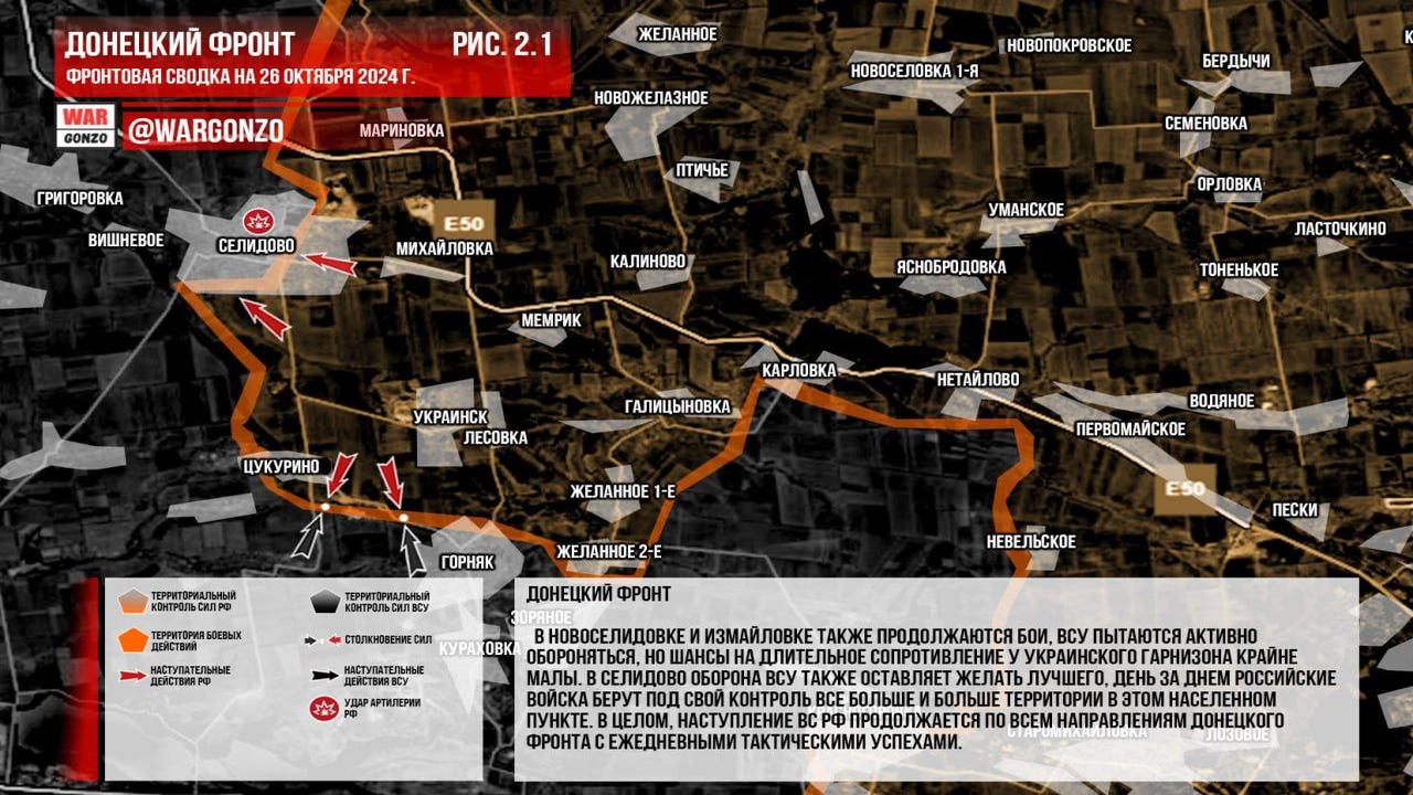 Ситуация на 26.10.2024 17:32. Юрий Подоляка сообщает: на 17.00 26.10.24 продолжается штурм Селидово. Он отметил, что окончательное оставление города противником пока неConfirmed, но высотные районы уже находятся под контролем российских войск. По данным блогов, российские солдаты проверяли документы у местного населения, что свидетельствует о снижении активности боевых действий в центре города. Также сообщается, что противник может покинуть западные одноэтажные улицы к утру. В текущий момент продолжаются бои в Вишневом, где российские части очищают территорию от противника. Южнее освобождается Новодмитровка, а атаки идут на Новоалексеевку, что предполагает движение на запад и попытку окружения Курахово. Таким образом, битва за Селидово, по мнению автора, скоро завершится.