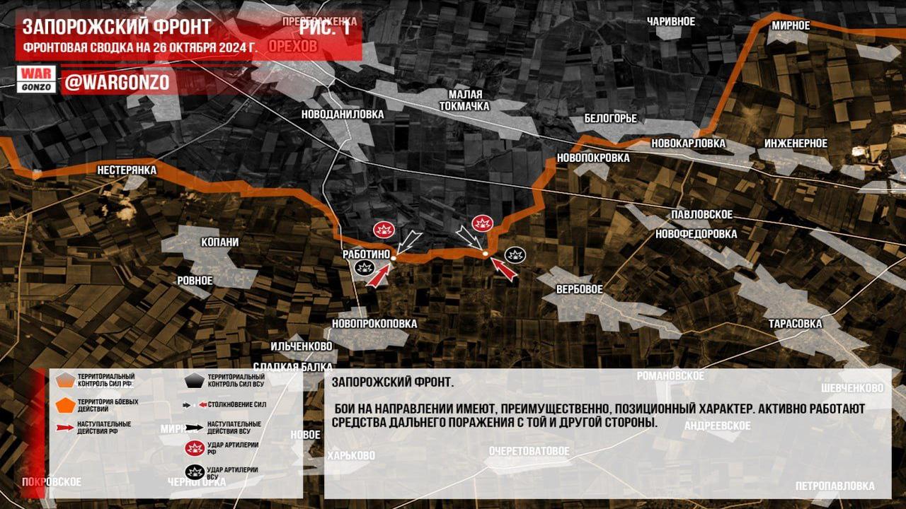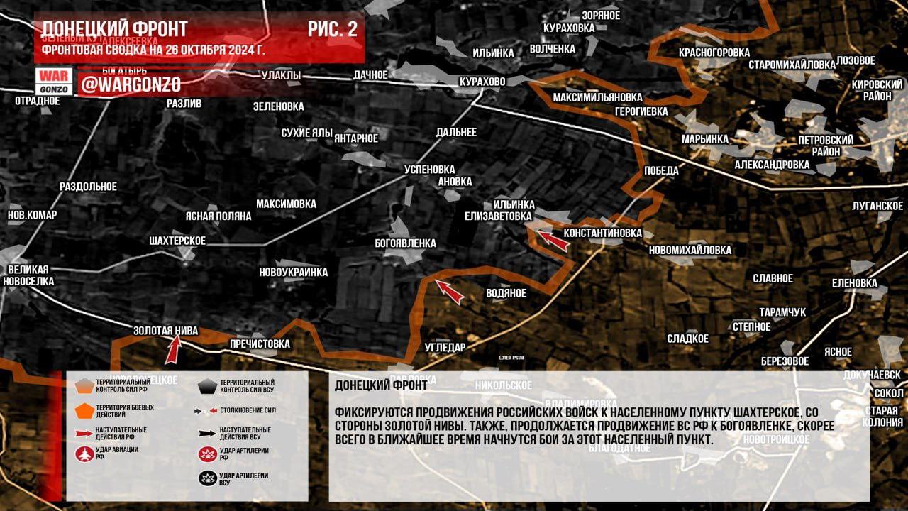 Ситуация на 26.10.2024 10:07. Канал Wargonzo сообщает: на утро 26 октября 2024 года ситуация на фронте характеризуется следующими ключевыми моментами. На Запорожском фронте бои носят позиционный характер с активным использованием дальнего поражения обеими сторонами. На Донецком фронте отмечается продвижение российских войск к Шахтерскому и Богоявленке, на которых ожидаются бои. В Новоселидовке и Измайловке продолжаются сражения, однако украинский гарнизон испытывает трудности с обороной. В Селидово российские войска захватывают территорию, а в целом наступление продолжается с тактическими успехами. На Часовоярском направлении ситуация остается стабильной, без изменений в линии боевого соприкосновения. В Курской области сообщения о серьезных изменениях отсутствуют; украинские силы пытаются проводить контратаки, но российская сторона оказывает давление на их оборону.