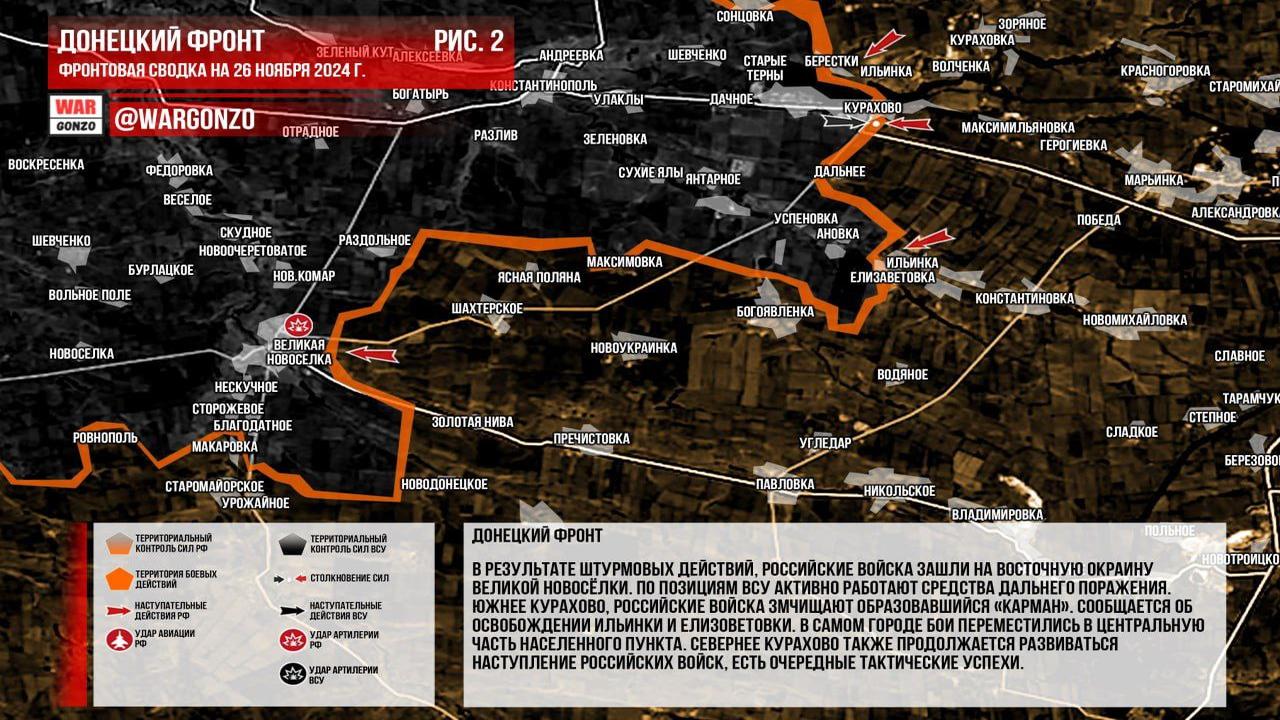 Ситуация на 26.11.2024 07:53. Юрий Подоляка сообщает: В своем сообщении на утро 26.11.24 он отметил, что на Южно-Кураховском направлении продолжаются бои, и ситуация для противника ухудшается. Подоляка написал о занятии высоток в Курахово и уничтожении контратакующей группы ВСУ, что демонстрирует продвижение штурмовиков. Он сообщил, что прорыв за трассу Курахово — Успеновка стал закономерным, а фронт противника здесь является «мягким». Подоляка также отметил, что действия наших частей в районе Констатинопольского подчеркивают намерение использовать преимущества охвата укрепленных позиций противника. Вероятность продолжения продвижения до впадения реки Сухие Ялы в Волчью была обозначена, с возможностью ускорения освобождения Курахово. Он также отметил, что дальнейшие действия могут произойти в случае удара по Разливу или Богатырю после стабилизации фронта в районе Большой Новосёлки.