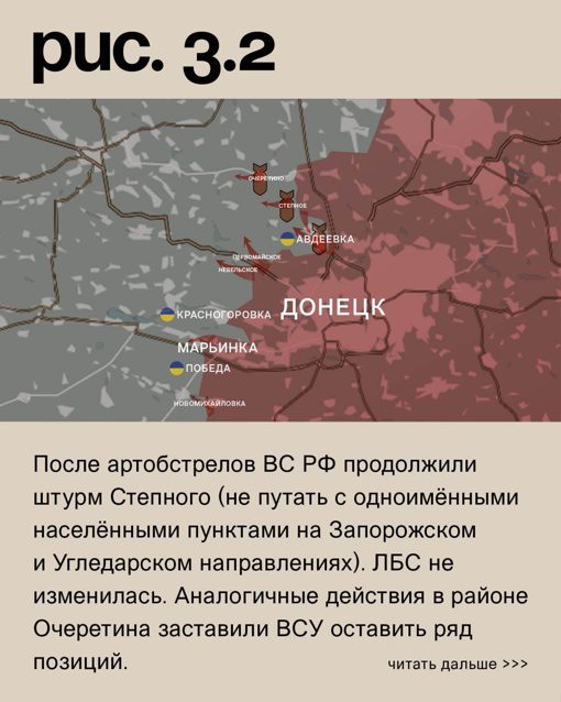 После артиллерийского обстрела ВС РФ продолжили штурм Степного (не путать с одноименными населенными пунктами на Запорожском и Угледарском направлениях). Линия разграничения боевых сторон не изменилась. В районе Очеретина аналогичные действия заставили вооруженные силы Украины отступить с нескольких позиций.