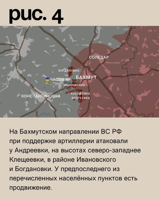 На Бахмутском направлении ВС РФ совершили атаку у Андреевки, на северо-западных высотах Клещеевки и в районе Ивановского и Богдановки. В одном из этих населенных пунктов продвигаются вражеские силы.
