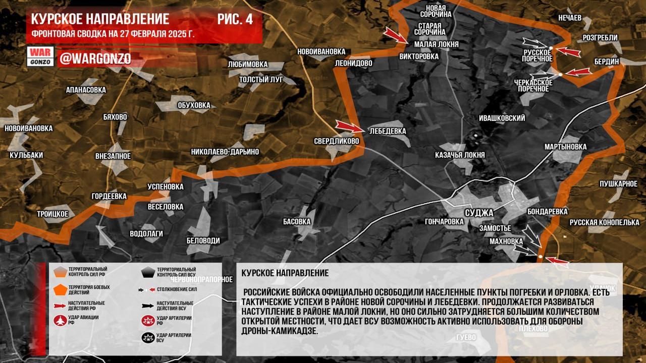 Канал Рыбарь сообщил, что по состоянию на 20:00 27 февраля 2025 года российские войска продолжают освобождение Курской области, выбивая противника с оккупированных территорий. Канал Рыбарь отметил освобождение населенных пунктов Никольский и Новой Сорочины, а также успехи в боях в Лебедевке. В Лебедевке продолжаются ожесточенные бои, и пока говорить о полном контроле над селом нельзя. Канал Рыбарь написал, что потеря населенного пункта для ВСУ будет иметь тяжелые последствия и может угрожать левому флангу и артерии снабжения Суджа — Юнаковка. Более того, данные о артиллерийском ударе по мосту в районе Горнали временно усложнят снабжение украинских формирований. Судя по наблюдаемой активности в районе реки Малая Локня, можно предположить, что ВС РФ перешли к новому этапу контрнаступления с целью перерезания трассы Суджа — Юнаковка, что может привести к фактическому окружению группировки противника в Курской области.