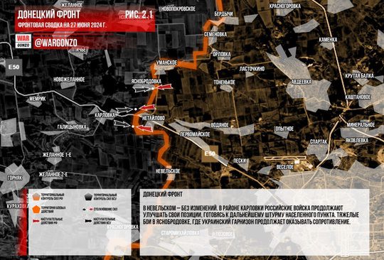 На Донецком фронте продолжаются бои в подступах к Константиновке, где ВС РФ имеют тактические успехи. В Невельском – без изменений. В районе Карловки российские войска готовятся к штурму населенного пункта. Тяжелые бои в Яснобродовке и в Соколе, где украинские войска продолжают сопротивление.