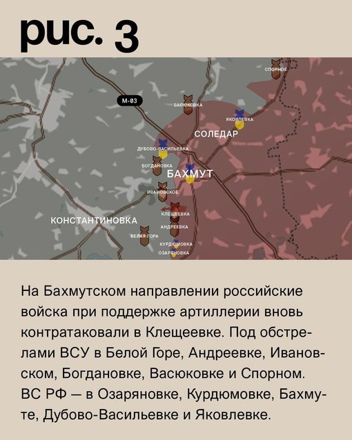 На Бахмутском (Артемовском) направлении продолжаются бои в районе Орехово-Васильевки. Наши войска успешно отразили атаку украинских военнослужащих у Берховки. В Клещеевке и Андреевке продолжаются встречные бои.