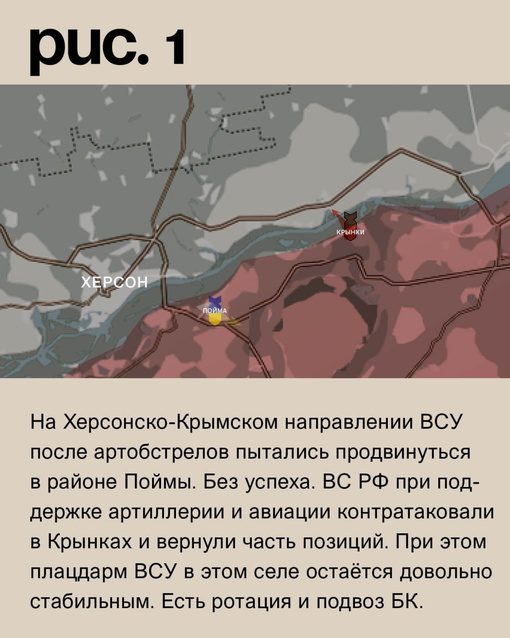 На Херсонско-Крымском направлении Вооруженные Силы Украины (ВСУ) безуспешно пытались продвинуться в районе Поймы после артиллерийских обстрелов. Вооруженные Силы Российской Федерации (ВС РФ), с поддержкой артиллерии и авиации, контратаковали в Крынках и вернули часть потерянных позиций. Все же, плацдарм ВСУ в этом районе остается достаточно стабильным, и продолжается ротация войск и подвоз боеприпасов.
