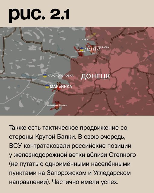 В районе Степного на Авдеевском участке русская армия закрепляется. Продолжаются бои на территории коксохимического завода. Мы контролируем промышленную зону и проводим очистку от врага. Кроме того, наши бойцы атаковали в районах Первомайского и Новомихайловки.