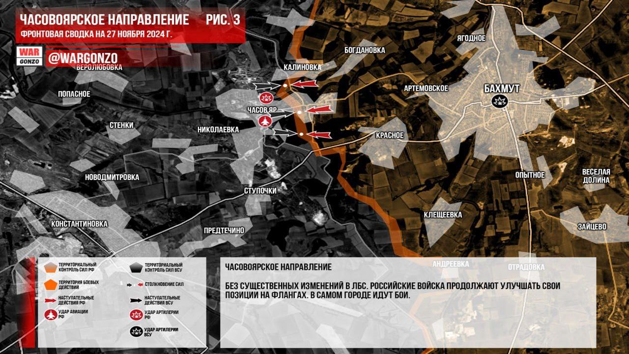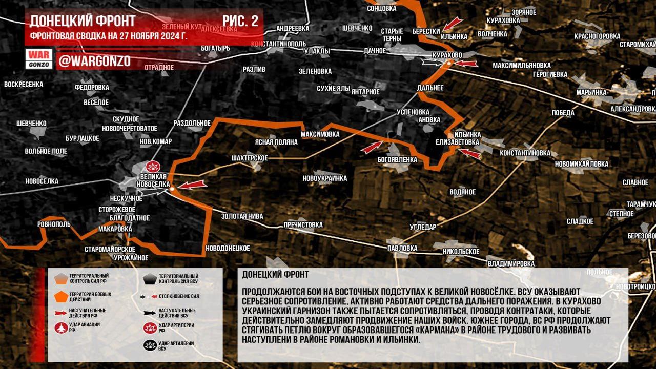 Ситуация на 27.11.2024 08:08. Канал Wargonzo сообщает: на утро 27.11.2024 не зафиксировано существенных изменений на фронте. На Запорожском фронте ВС РФ продолжают оказывать давление на оборону противника в Ореховском направлении. На Донецком фронте продолжаются бои на восточных подступах к Великой Новосёлке, где ВСУ активно сопротивляются и осуществляют контратаки в Курахово, замедляя продвижение российских войск. Южнее города продолжается стягивание петли вокруг «кармана» в районе Трудового, а также наступление в районе Романовки и Ильинки. На Часовоярском направлении изменений в ЛБС не наблюдается, российские войска улучшают свои позиции. В Курской области отмечаются незначительные, но трудные продвижения ВС РФ в районе Дарьино, где также продолжаются встречные бои.