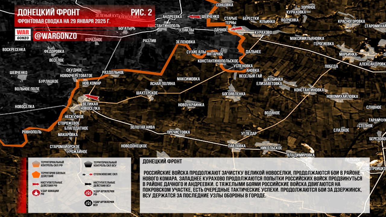 Ситуация на 29.01.2025 08:19. Канал Wargonzo сообщает: на утро 29.01.2025, фронтовая сводка фиксирует продолжение позиционных боев на Запорожском фронте без значительных изменений в ЛБС. На Донецком фронте российские войска продолжают зачистку Великой Новоселки и идут бои в районе Нового Комара. На запад от Курахово зафиксированы попытки продвижения российских войск в районе Дачного и Андреевки, а также тактические успехи на Покровском участке и бои за Дзержинск, где ВСУ удерживают последние узлы обороны. На Часовоярском направлении изменений нет, однако инициатива остается за российскими войсками, которые продолжают штурм Часов Яра. В Курской области российские войска продолжают давить на оборону ВСУ, в то время как украинские силы пытаются перебросить дополнительные резервы.