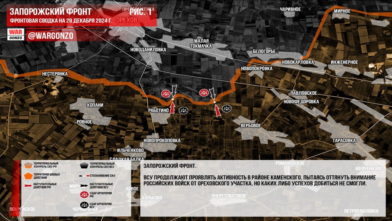 Ситуация на 29.12.2024 10:24. Канал Wargonzo сообщает: на утро 29.12.2024 украинские войска продолжают активные действия на Запорожском фронте в районе Каменского, однако без успехов. На Донецком фронте российские войска продвигаются к территории ТЭС в Курахово, несмотря на попытки украинского гарнизона оттянуться. Также отмечается перемещение позиций украинских дроноводов вглубь промышленной зоны, в то время как зачистка жилой застройки от точек сопротивления продолжается. На Часовоярском направлении российские войска оказывают давление на оборону ВСУ, без значительных изменений. В Курской области российские силы пытаются вытеснить украинские войска с занимаемых позиций, однако несмотря на некоторые успехи, полное перехватывание инициативы пока не достигнуто.