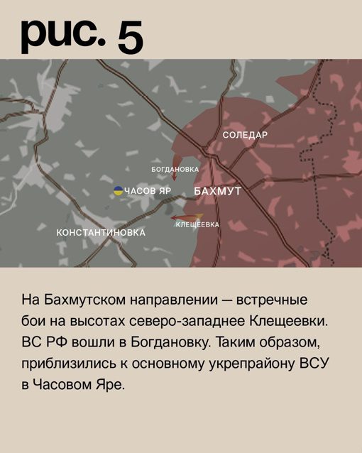 На Бахмутском направлении происходят бои на высотах недалеко от Клещеевки. Российская армия уже вошла в Богдановку и продвигается в сторону основных укреплений ВСУ в Часовом Яре.