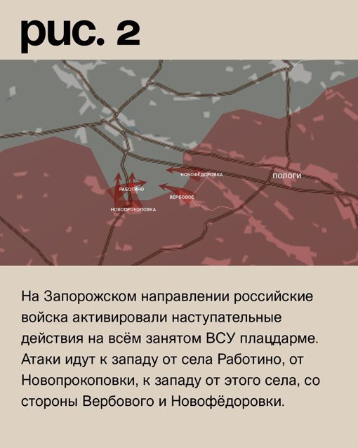На Запорожском направлении российские войска начали наступление на территории ВСУ. Они атакуют село Работино, Новопрокоповку, Вербовое и Новофёдоровку. Все эти нападения направлены на запад.