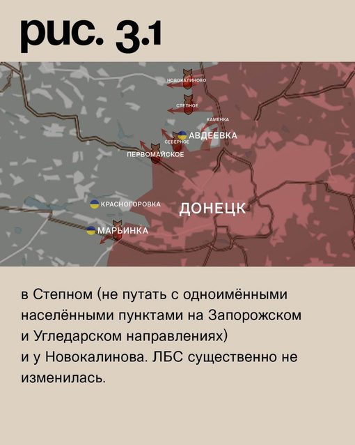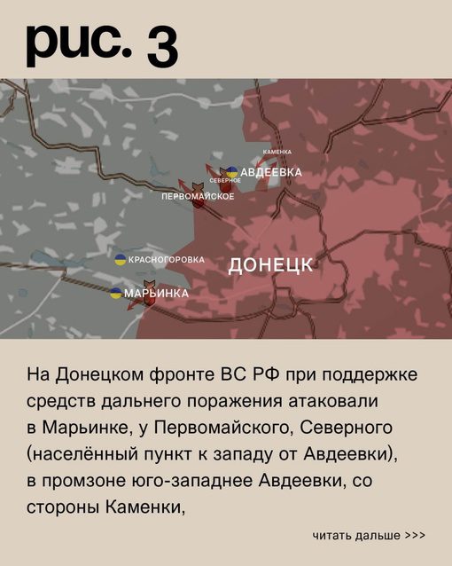 На Донецком фронте российские войска при существенной поддержке средств дальнего поражения атакуют в Марьинке, у Первомайского, Северного (населённый пункт к западу от Авдеевки), в промзоне юго-западнее Авдеевки, со стороны Каменки, в Степном и у Новокалинова. Ситуация на линии фронта остаётся примерно неизменной.