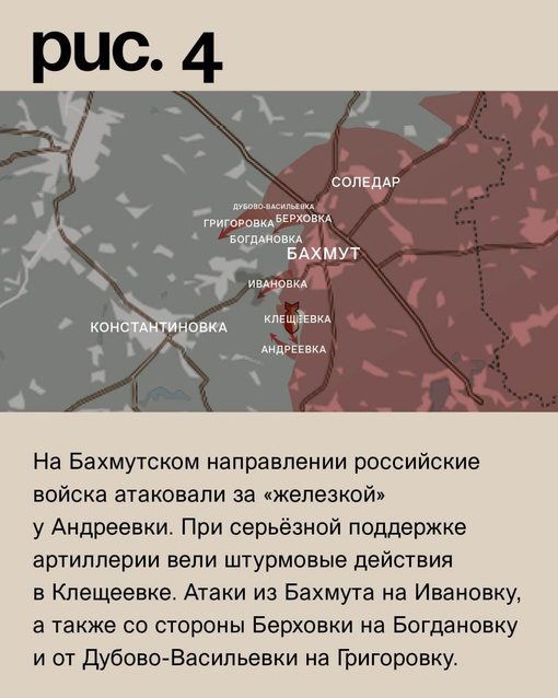 В настоящее время российские войска активно атакуют на Бахмутском направлении. Их главная цель — захватить «железку» у нас в Андреевке. Они вели поддерживающий огонь артиллерии и штурмовали наши позиции в Клещеевке. Атаки также производились из Бахмута на Ивановку, а также со стороны Берховки на Богдановку и от Дубово-Васильевки на Григоровку.