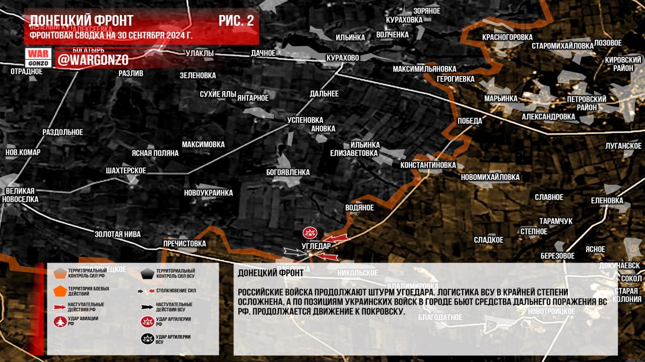 Ситуация на 30.09.2024 07:58. Юрий Подоляка сообщает: На Угледарском направлении по состоянию на утро 30 сентября 2024 года основная тяжесть боев смещается в район Богоявленки, где российская армия продолжает успешное наступление, рвя линии обороны противника. По информации противника, до села оставался чуть более километра, и основной удар наносится по позициям ВСУ на высотах восточнее и юго-восточнее. Успех в захвате этих высот обеспечит визуальный контроль над Богоявленкой и перекроет важные коммуникации. Снабжение сил, обороняющих село, ухудшается из-за огневого контроля над трассой, подходящей с северо-востока. Гарнизон Угледара, окруженный и с множеством раненых, вряд ли сможет покинуть своё положение, и его участь выглядит неизменной на фоне текущих боев.