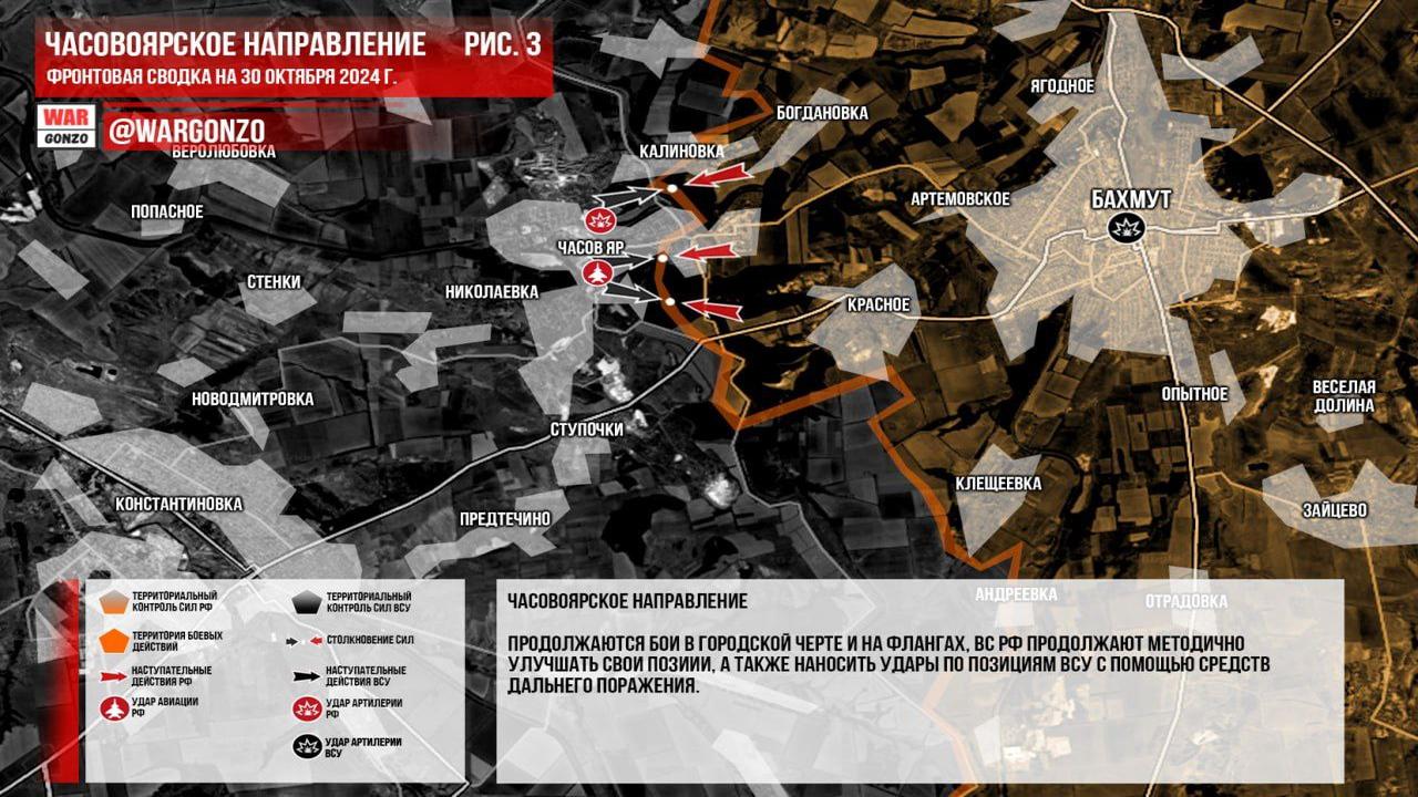 Ситуация на 30.10.2024 09:59. Юрий Подоляка сообщает: На утро 30.10.24 отмечается неспешное продвижение на ЧасовЯрском направлении. Он сообщил, что успех развивается южнее Часова Яра, где постепенно занимают преобладающие высоты и берут под огневой контроль дороги, снабжающие гарнизон противника в городе. Подоляка также написал, что при продвижении по дороге на два километра открывается вид на Константиновку, что может создать сложные условия для ВСУ.