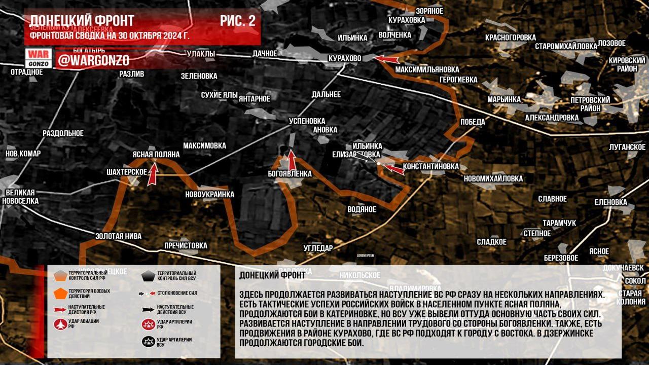 Ситуация на 30.10.2024 08:22. Канал Wargonzo сообщает: Фронтовая сводка на утро 30.10.2024. На Запорожском фронте без существенных изменений, продолжаются позиционные бои и активная работа средств дальнего поражения. На Донецком фронте отмечено развитие наступления ВС РФ на нескольких направлениях, в том числе тактические успехи в Ясной Поляне и бои в Катериновке, где ВСУ вывели основные силы. Продолжается наступление в направлении Трудового и продвижение в районе Курахово. В Дзержинске фиксируются городские бои. На Часовоярском направлении бои продолжаются в городской черте, при этом ВС РФ улучшают свои позиции и наносят удары по ВСУ. В Курской области без существенных изменений, продолжаются встречные бои и работа средств дальнего поражения.