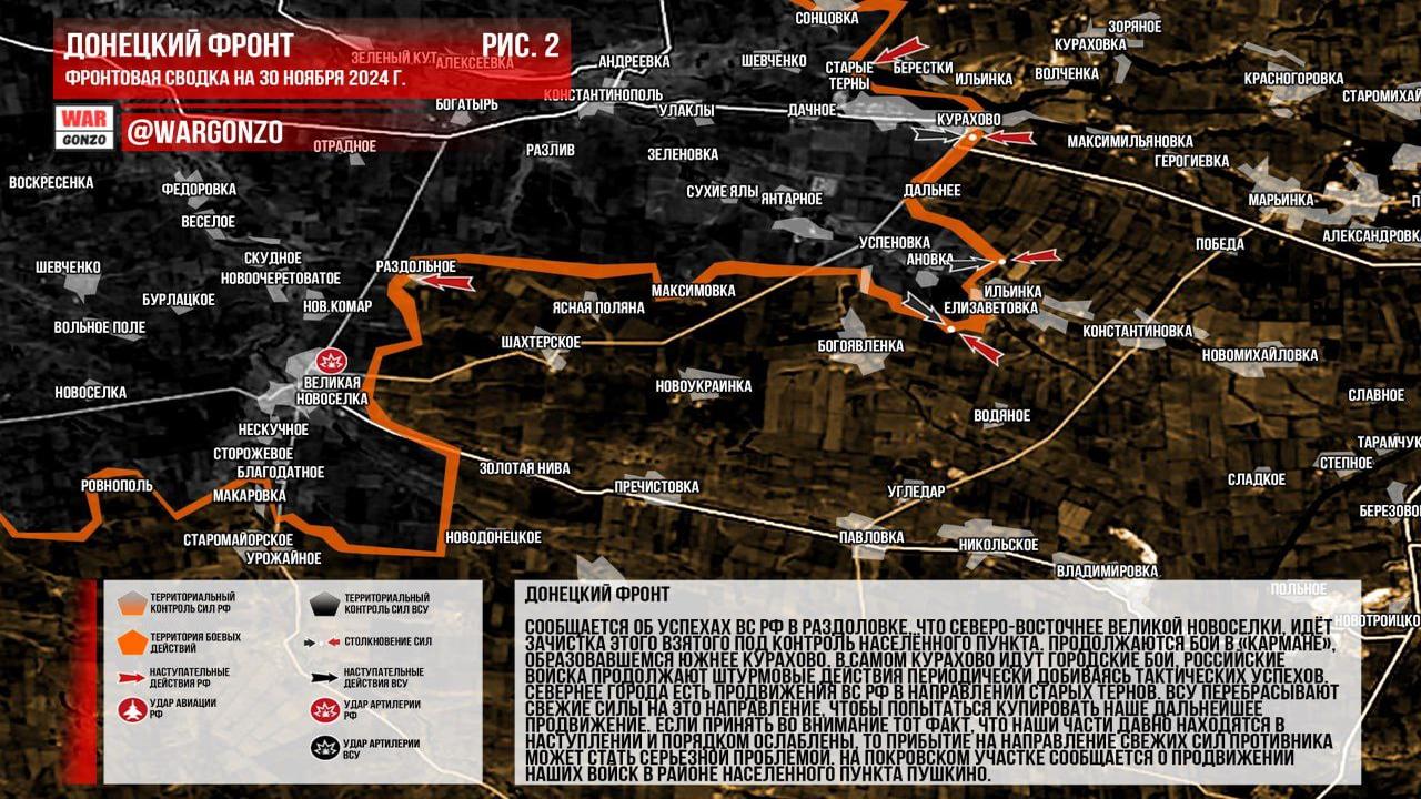 Ситуация на 30.11.2024 10:10. Канал Wargonzo сообщает: Фронтовая сводка на утро 30.11.2024. На Запорожском фронте отсутствуют серьезные изменения, бои имеют позиционный характер. На Донецком фронте отмечены успехи ВС РФ в Раздоловке, идет зачистка населенного пункта. Продолжаются бои в «кармане» южнее Курахово, где идут городские бои и штурмовые действия со стороны российских войск. Севернее Курахово зафиксировано продвижение ВС РФ в сторону Старых Тернов, в ответ на что ВСУ перебрасывают свежие силы. На Покровском участке сообщается о продвижении российских войск в районе Пушкино. В Часов Яре продолжаются тяжелые городские бои, где ВСУ оказывают сопротивление, а ВС РФ на флангах стремятся улучшить свои позиции. В Курской области ситуация также без существенных изменений, где ВС РФ пытаются давить на оборону ВСУ, но противник сохраняет достаточно сил для контратак. Бои на нескольких участках продолжают носить встречный характер.