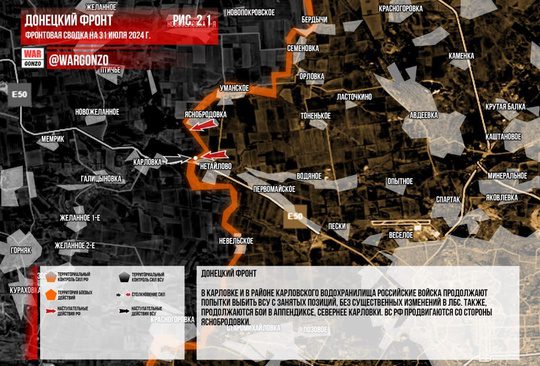 На Донецком фронте продолжается очистка Красногоровки. Российские войска пытаются вытеснить украинские силы из Карловки и окрестностей Карловского водохранилища. Сражения продолжаются в аппендиксе к северу от Карловки, где российские войска движутся к Яснобродовке. Непрекращающиеся бои идут также в Нью-Йорке, где российские войска добиваются успехов.