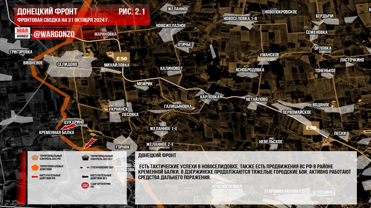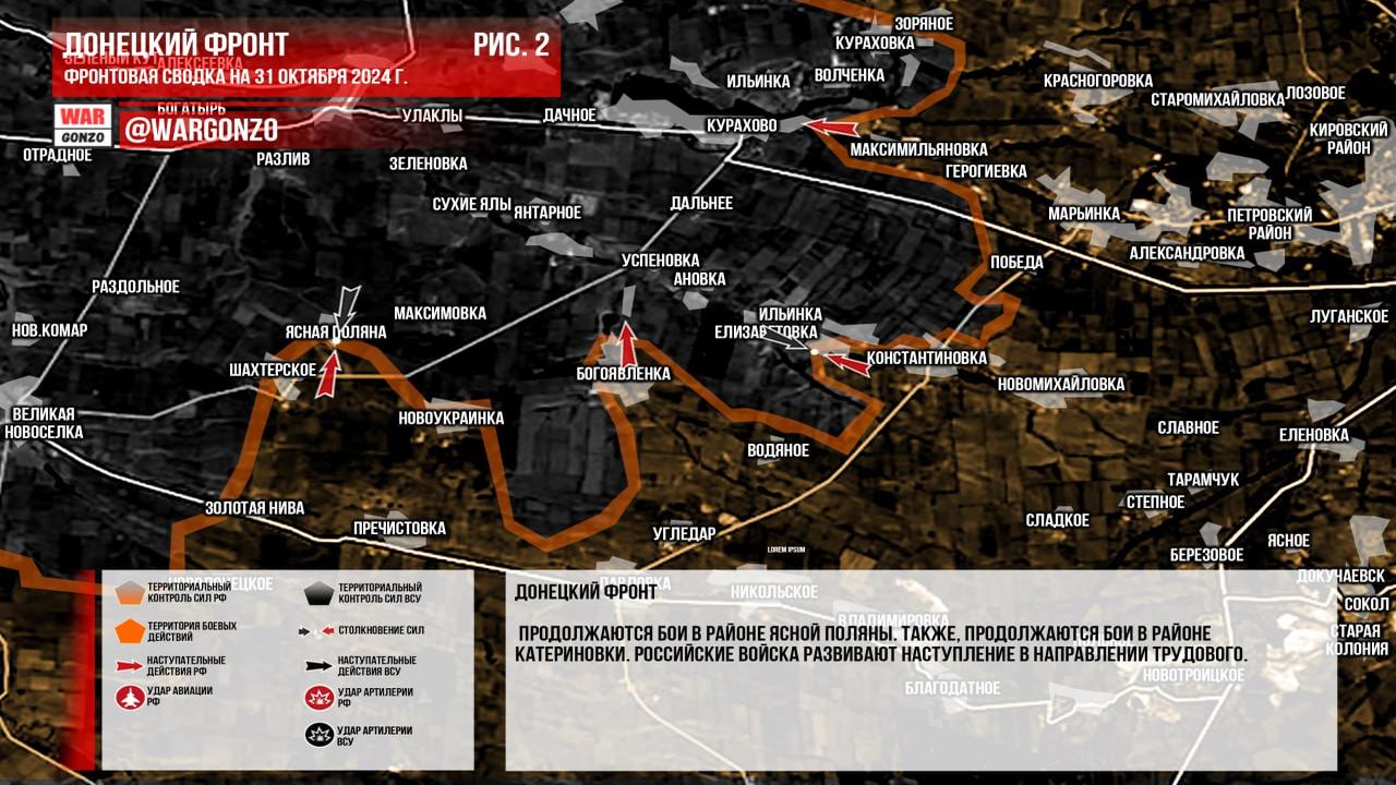 Ситуация на 31.10.2024 08:17. Канал Wargonzo сообщает: на утро 31.10.2024 зафиксированы следующие события на фронте. На Запорожском фронте севернее Работино российские войска отбили несколько позиций противника, в остальном ситуация без существенных изменений. На Донецком фронте продолжаются бои в районах Ясной Поляны и Катериновки, также наблюдается наступление российских войск в направлении Трудового и тактические успехи в Новоселидовке. Продвижения отмечены в районе Кременной Балки, а в Дзержинске продолжаются тяжелые городские бои с активной работой средств дальнего поражения. На Часовоярском направлении также без существенных изменений, продолжаются бои в городской черте и на флангах, российские войска продолжают обстреливать позиции ВСУ. В Курской области ситуация стабильная, продолжаются встречные бои, предполагается, что российские войска взяли перерыв перед возобновлением активной фазы наступления.