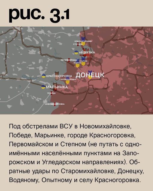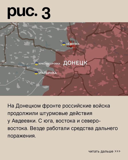 На Донецком фронте российские войска продолжают наступление у Авдеевки с юга, востока и северо-востока. Силы РФ используют средства дальнего поражения. ВСУ подвергаются обстрелам в Новомихайловке, Победе, Марьинке, Красногоровке, Первомайском и Степном (не путать с одноименными населенными пунктами на Запорожском и Угледарском направлениях). В ответ ВСУ наносят удары по Старомихайловке, Донецку, Водяному, Опытному и селу Красногоровка.