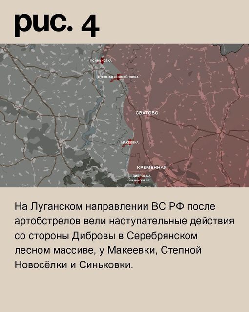 На Луганском направлении после артиллерийских обстрелов ВС РФ начали наступление в Серебрянском лесном массиве у Дибровы, а также у Макеевки, Степной Новоселки и Синьковки.