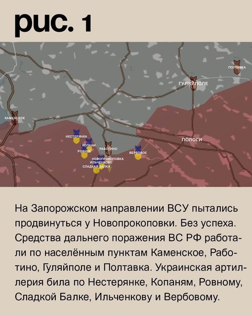 На Запорожском направлении ВСУ безуспешно пытались продвинуться у Новопрокоповки. Силы РФ атаковали населенные пункты Каменское, Работино, Гуляйполе и Полтавка. Украинская артиллерия наносила удары по Нестерянке, Копаням, Ровному, Сладкой Балке, Ильченкову и Вербовому.