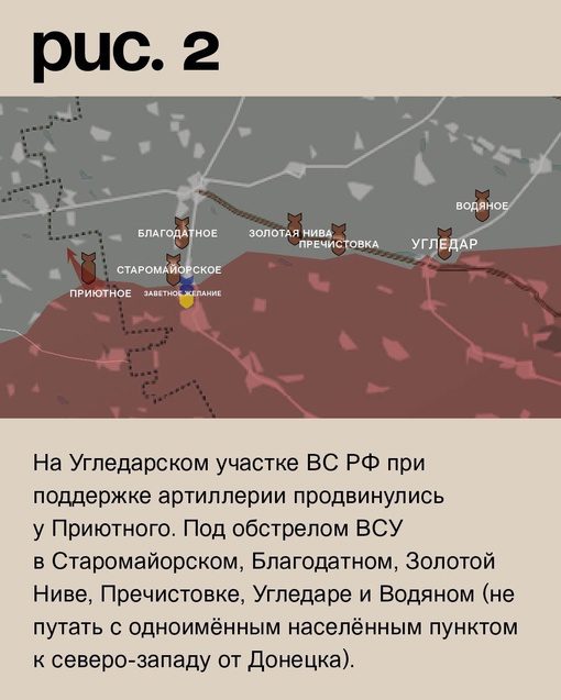 На Угледарском участке силы РФ с поддержкой артиллерии продвигаются у Приютного. ВСУ подвергаются обстрелам в Старомайорском, Благодатном, Золотой Ниве, Пречистовке, Угледаре и Водяном (не путать с одноименным населенным пунктом к северо-западу от Донецка).