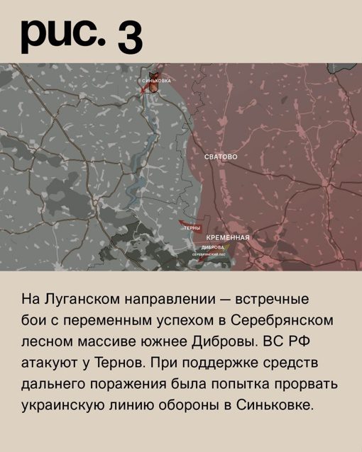 На Луганском направлении происходят встречные бои в Серебрянском лесном массиве южнее Дибровы. Российская армия атакует украинские позиции у Тернов с поддержкой огня издалека. Они также пытаются прорваться через украинскую линию обороны в Синьковке.