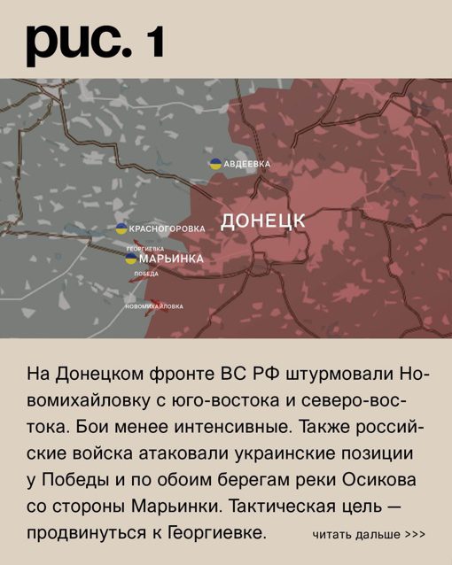 На Донецком фронте Российская армия атакует Новомихайловку со всех сторон. Бои здесь менее интенсивные. Они также атакуют украинские позиции у Победы и вдоль реки Озера Марьинка, с целью продвинуться к Георгиевке и покорить военную базу в Курахове. В Невельском встречные бои уже начались.