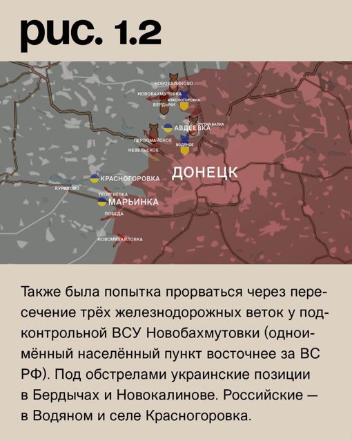 В Первомайске российская армия наносит мощные атаки с помощью артиллерии и ракетных систем. Они атакуют Авдеевку с востока от Крутой Балки и с северо-востока у коксохимического завода. Они также пытаются прорваться через пересечение трех железнодорожных веток в Новобахмутовке, которая контролируется Вооруженными силами Украины.