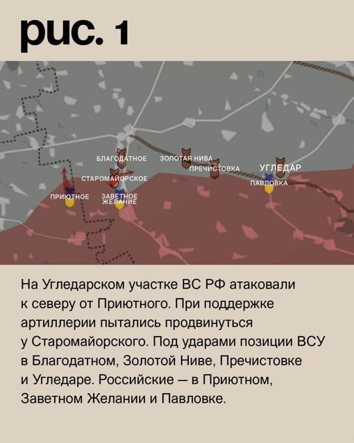 В районе Угледара ВС РФ атаковали к северу от Приютного. Они используют артиллерию, чтобы продвигаться в Старомайорском. Силы ВСУ под огнем в Благодатном, Золотой Ниве, Пречистовке и Угледаре. Российские войска находятся в Приютном, Заветном Желании и Павловке.