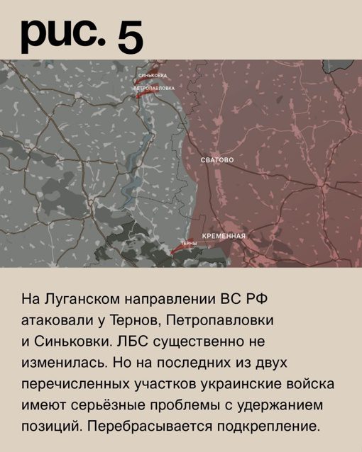 На Луганском направлении российские войска атакуют у Тернова, Петропавловки и Синьковки. Обстановка в зоне спецоперации остается примерно такой же. Однако у украинских войск возникают серьезные проблемы с удержанием позиций на двух из перечисленных участков. К ним направляется подкрепление.