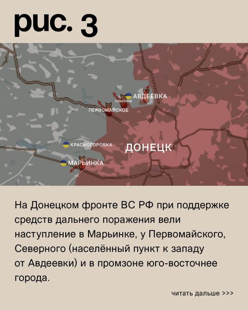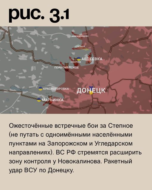 В Донецке русская армия продвигается на двух участках: в районе Степного и к северо-востоку от коксохимического завода. Украинская армия также терпит неудачи на востоке от Авдеевки и в промышленной зоне. Бои продолжаются на окраинах Марьинки.