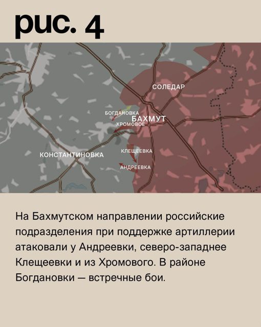 На Бахмутском (Артемовском) направлении русская армия перекрыла трассу в районе Часов Яр, по которой ВСУ снабжали свою группировку около Артемовска. Кроме того, наши бойцы продвигаются на юг от Берховского водохранилища. Бои за высоты продолжаются в Клещеевке.