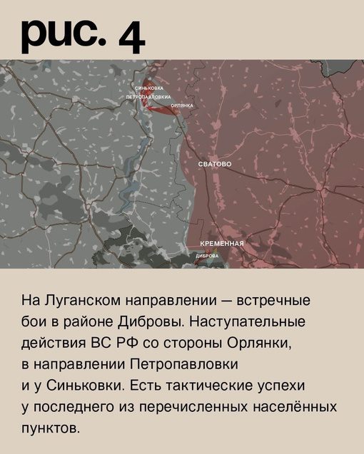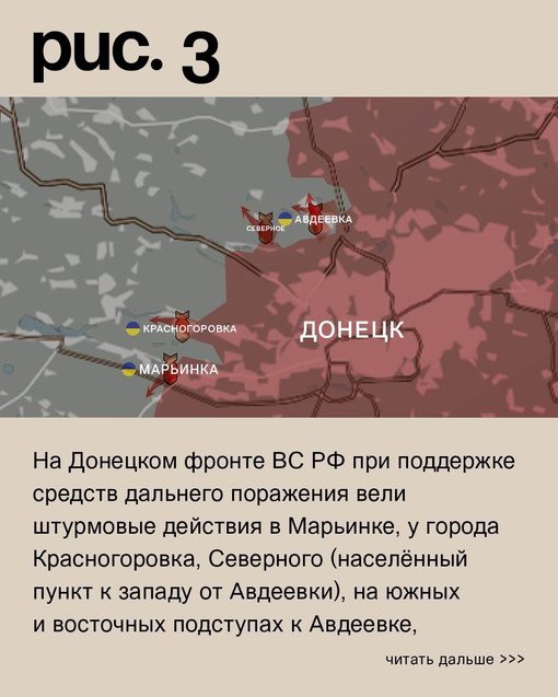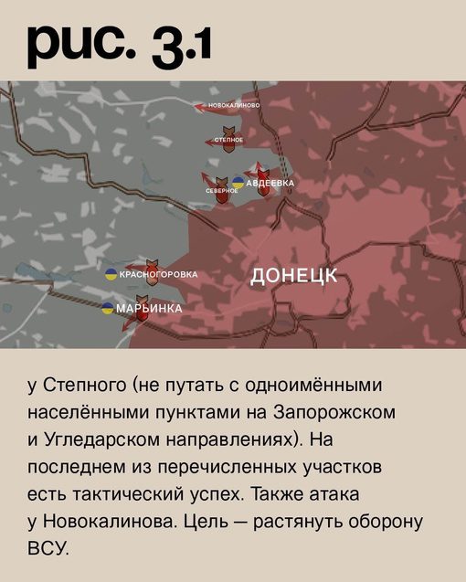 Также на Донецком фронте вооруженные силы России с помощью средств дальнего поражения ведут наступательные операции в Марьинке, Красногоровке, Северном, на южных и восточных подступах к Авдеевке, а также у Степного. Во всех этих районах есть некоторые тактические успехи. Российская армия также атакует у Новокалинова с целью раздвигания обороны Вооруженных Сил Украины.